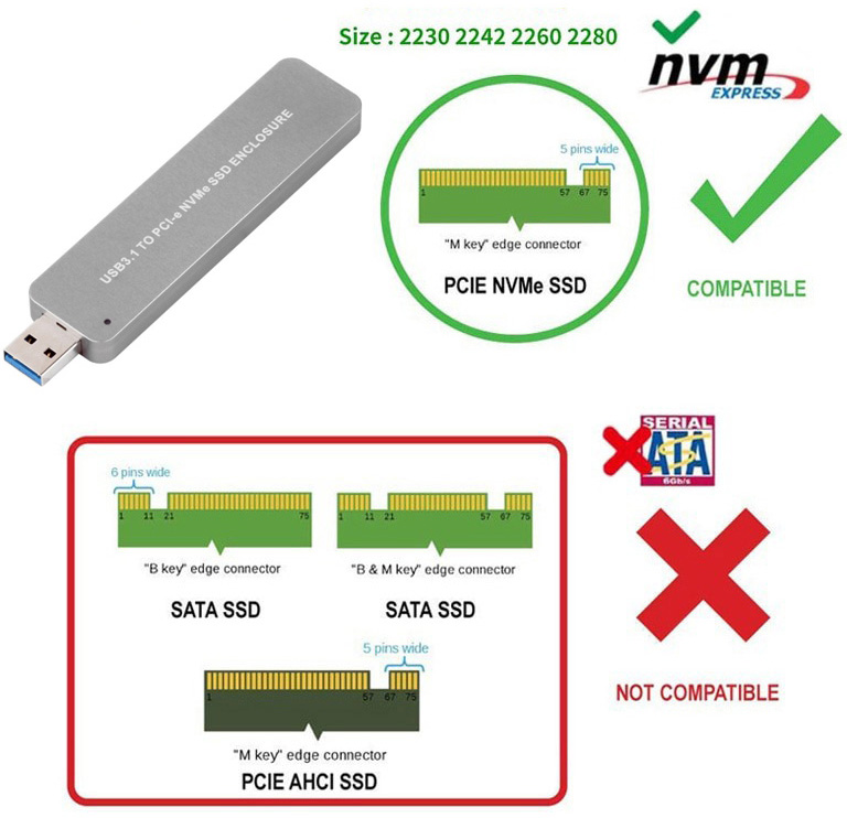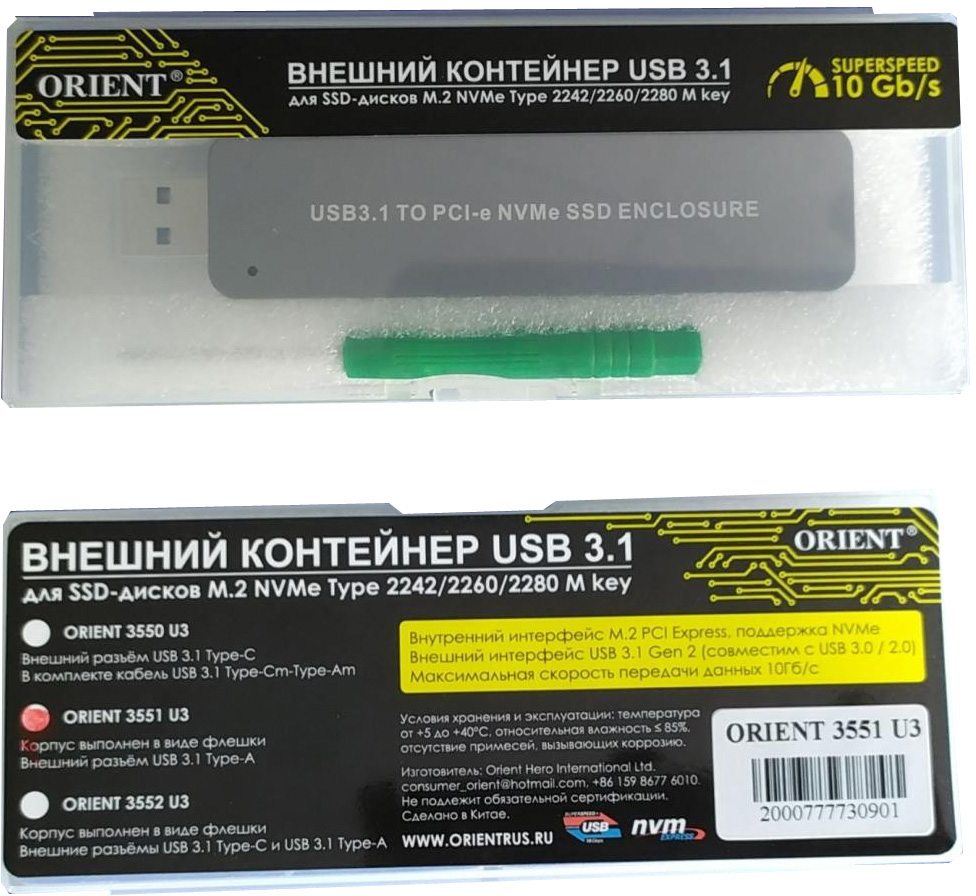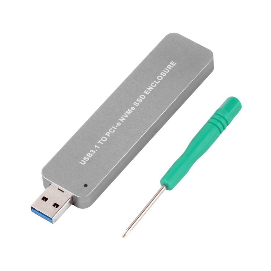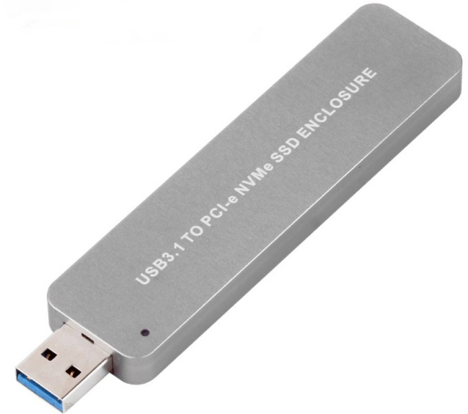 внешний корпус для SSD M.2 NVMe Type 2242/2260/2280 M key, выполнен в виде флешки, материал: алюминий, интерфейс подключения: USB 3.1, питание от USB-порта, поддерживает UASP, TRIM