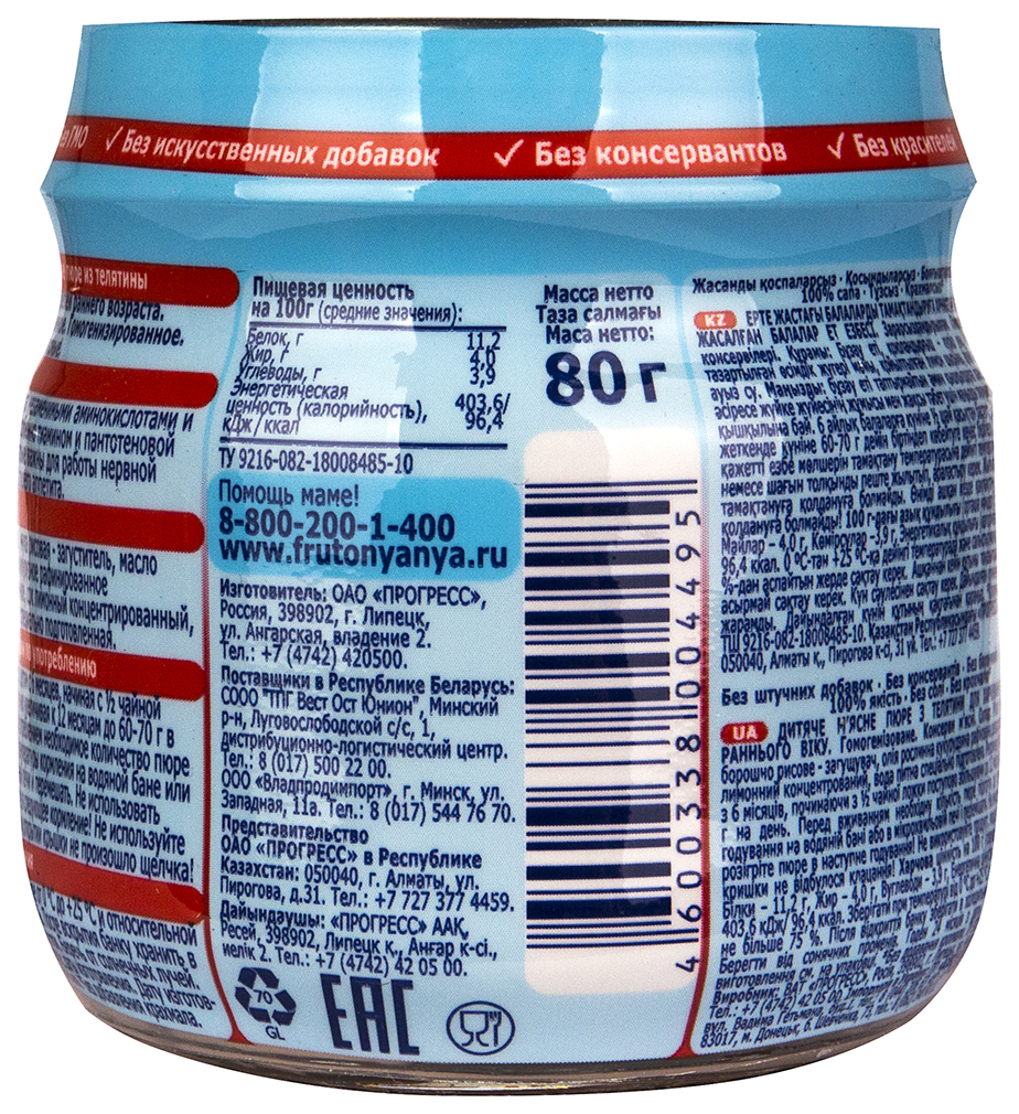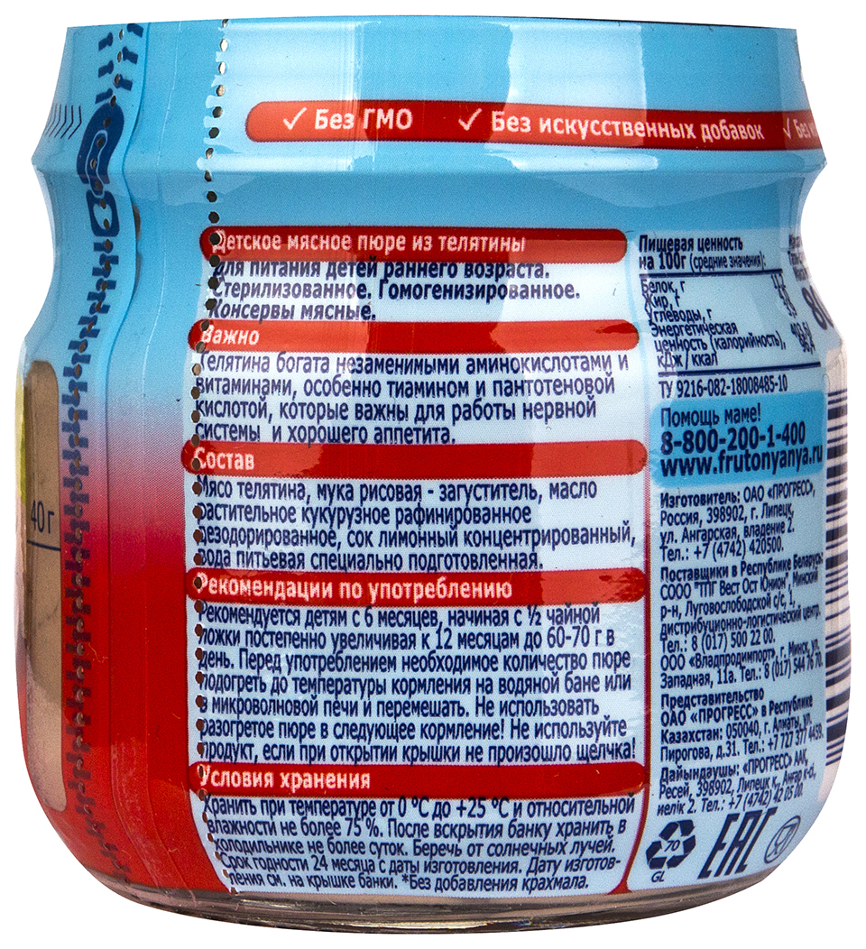 - Состав мясо телятина; мука рисовая; масло растительное кукурузное рафинированное дезодорированное; сок лимонный концентрированный; вода питьевая специально подготовленная