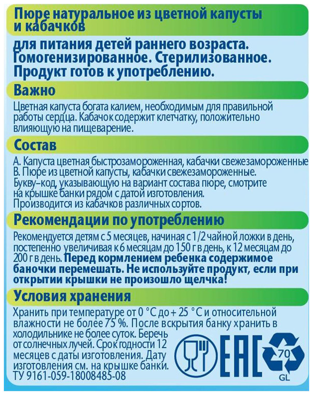 - Состав а; капуста цветная быстрозамороженная; кабачки свежезамороженные; в; пюре из цветной капусты; кабачки свежезамороженные; букву-код, указывающую на вариант состава пюре, смотри на крышке банки рядом с датой изготовления