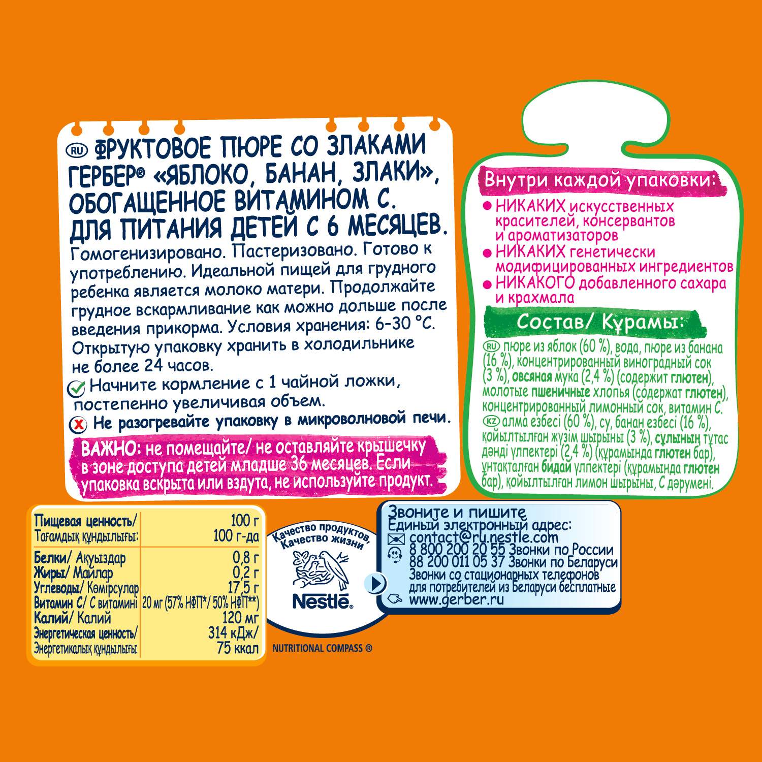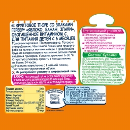 - Состав Пюре из яблок (60 %), вода, пюре из банана (16 %), концентрированный виноградный сок (3 %), овсяные цельнозерновые хлопья (2,4 %) (содержат глютен), молотые пшеничные хлопья (1,5 %) (содержат глютен), концентрированный лимонный сок, витамин С (L-аскорбиновая кислота).