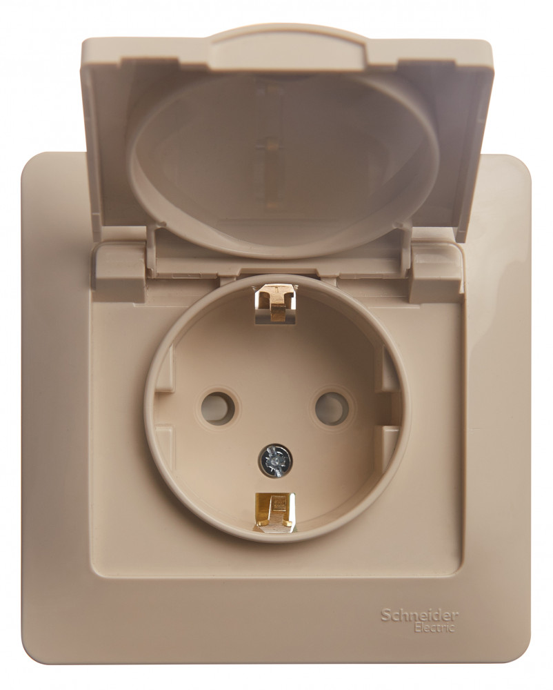 Розетка Systeme Electric (ранее Schneider Electric) серии Glossa (в сборе, цвет бежевый) одинарная с заземлением, шторками и крышкой подходит для сетей 250 В, на ток 16 А.