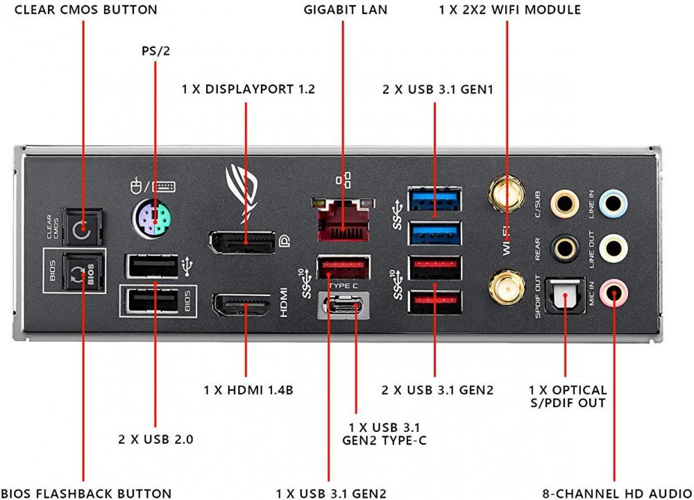 - Разъёмы на задней панели PS/2, 2 x USB 2.0, 5 x USB 3.1, USB 3.1 Type-C, HDMI, DisplayPort, RJ-45, S/PDIF (оптический)