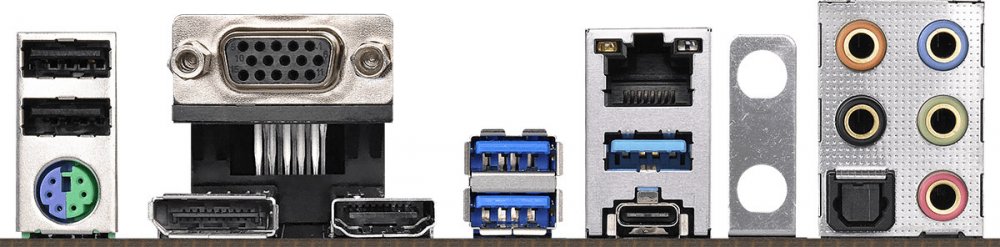 - Разъёмы на задней панели PS/2, 2 x USB 2.0, 3 x USB 3.1, USB 3.1 Type-C, VGA (D-Sub), HDMI, DisplayPort, RJ-45, S/PDIF (оптический)