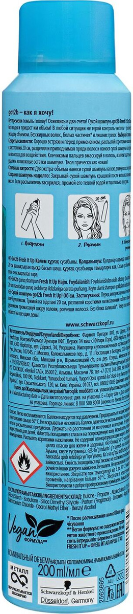 - Способ применения: Секреты свежести для горячих брюнеток: перед использованием накрой плечи полотенцем. Распыляй короткими нажатиями на сухие волосы с расстояния 20 см, разделяя и приподнимая пряди волос и нанося сухой шампунь на корни. Оставь ненадолго на волосах для воздействия. Кончиками пальцев вмассируй в волосы, а затем тщательно их расчеши, чтобы удалить возможные остатки шампуня. Твоя прическа как новая! Стильные хитрости: Нанеси непосредственно на корни волос для маскировки отросших корней, если твои волосы окрашены или тонированы в темный цвет.