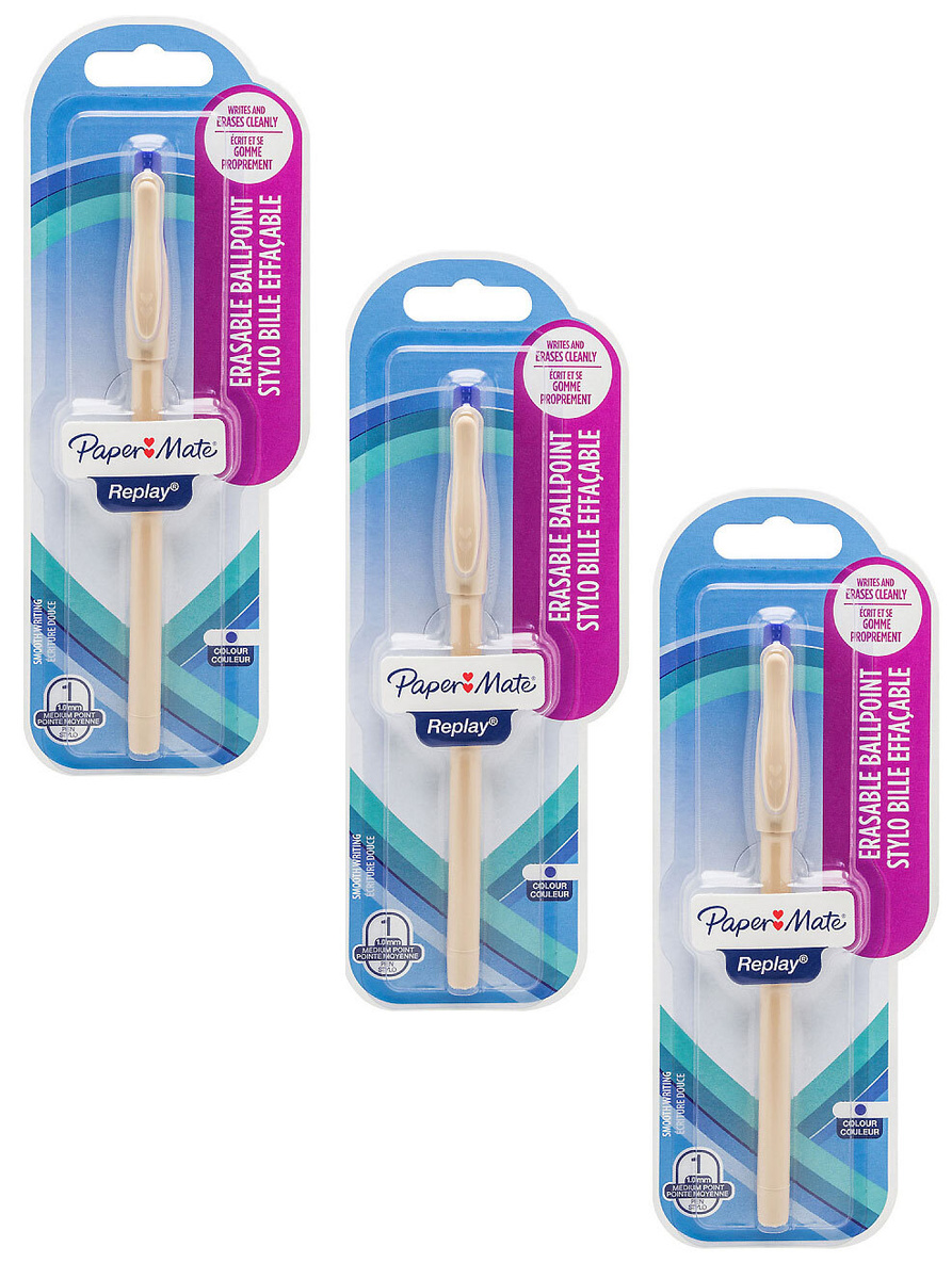 - Комплектация Ручка шариковая со стираемыми чернилами, 1 мм, синий цв., пластик корп., PAPER MATE REPLAY - 3 штуки.