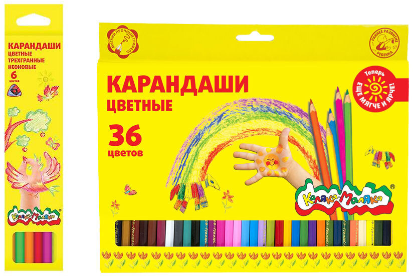 - Комплектация Набор цветн. карандашей Каляка-Маляка 36 цв. шестигранные дерев. - 1 штука. Карандаши цветные Каляка-Маляка 6 цветов, неоновые - 1 штука.