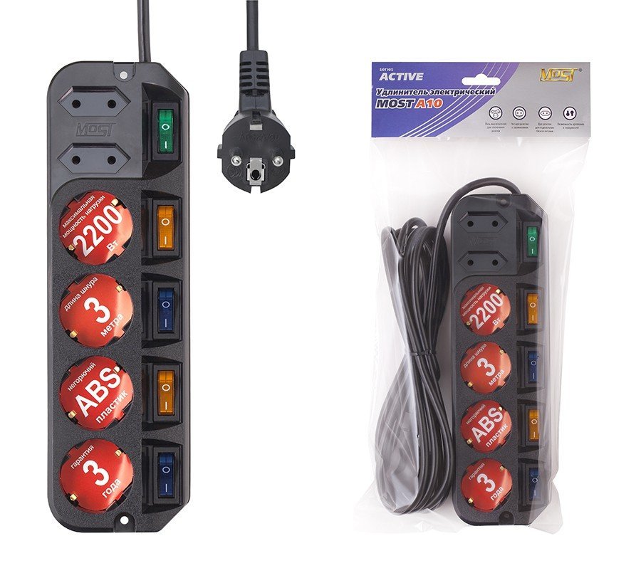 удлинитель A10 1.6м (6 розеток) (пакет ПЭ) A10 1,6 черный