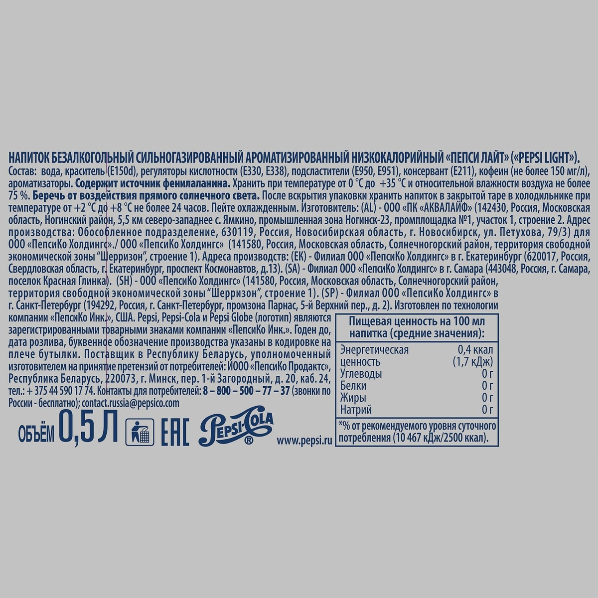 - Состав: Вода, краситель (Е150d)), регуляторы кислотности (Е330,Е338), подсластители (Е950, Е951), консервант (Е211), кофеин (не более 150 мг/л), ароматизаторы. Содержит источник фенилаланина.