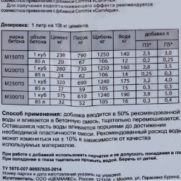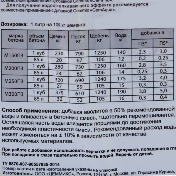 Условия использованияДля повышения прочности. добавка вводится в 50% рекомендованной воды и вливается в бетонную смесь, тщательно перемешивается