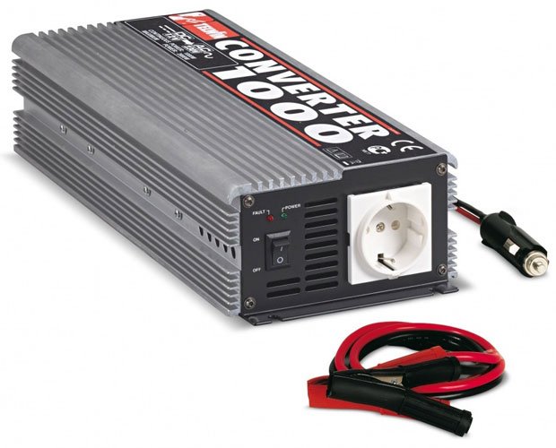 Входное напряжение: 12В; выходное напряжение 220В В; номинальная мощность 1000 Вт; пиковая мощность 2000 Вт; способ подключения: к прикуривателю, к клеммам АКБ; количество розеток 1.