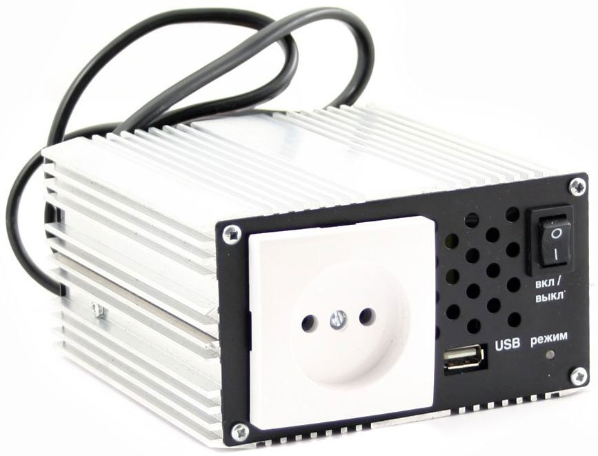 Входное напряжение: 12В; выходное напряжение 220В В; пиковая мощность 900 Вт; способ подключения: к клеммам АКБ; USB-порт; количество розеток 1.