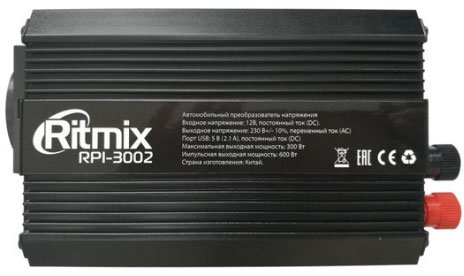Входное напряжение: 12В; выходное напряжение 220В В; номинальная мощность 300 Вт; пиковая мощность 600 Вт; способ подключения: к прикуривателю, к клеммам АКБ; USB-порт; количество розеток 1.