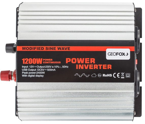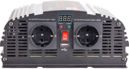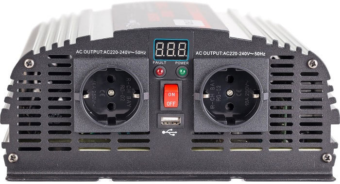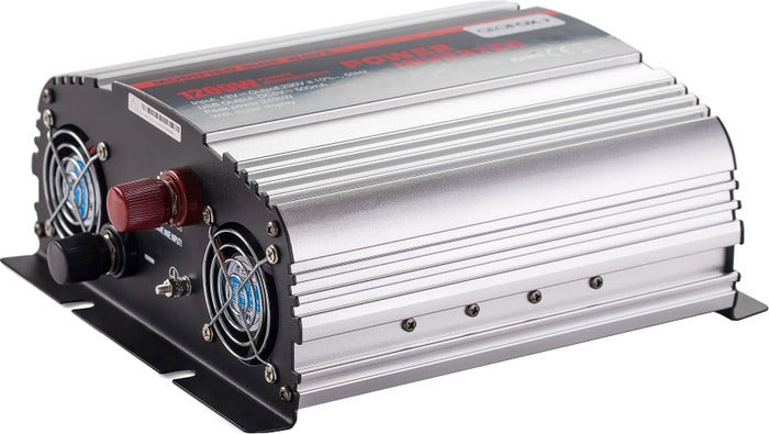 Входное напряжение: 12В; выходное напряжение 220В В; номинальная мощность 1200 Вт; пиковая мощность 2400 Вт; способ подключения: к клеммам АКБ; USB-порт; количество розеток 2.