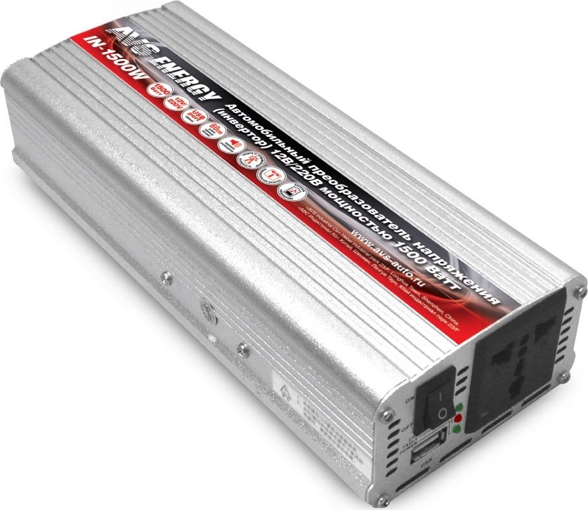 Входное напряжение: 12В; выходное напряжение 220В В; номинальная мощность 1500 Вт; пиковая мощность 3000 Вт; способ подключения: к прикуривателю, к клеммам АКБ; USB-порт; количество розеток 1.