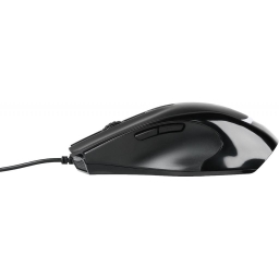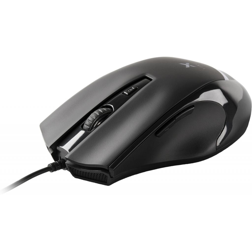 У пристрої передбачені 1 коліщатко і 5 кнопок, серед яких є також клавіша, що дозволяє перемикати роздільну здатність до 800 dpi, що зручно на той випадок, якщо вам тимчасово знадобиться не підвищена чутливість, а рішення задач іншого роду. Завдяки симетричності форм з цією мишею можна працювати і правою рукою, і лівої. Заворожлива синя підсвітка додає ще більшої елегантності та естетичності і без того привабливому дизайну вироби. Довжина вбудованого USB-кабелю моделі становить 150 см, що робить її ще більш зручною в експлуатації.