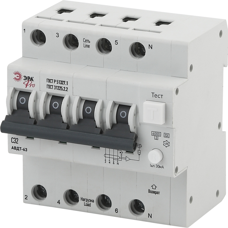 ЭРА NO-901-99 АВДТ Характеристика Pro NO-901-99 АВДТ 63 3P+N C32 30мА тип A (Б0031849)
