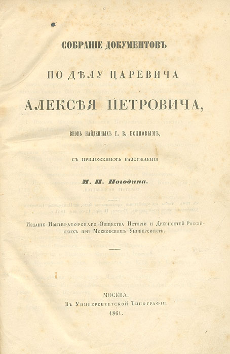 Собрание документов по делу царевича Алексея Петровича, вновь найденных Г. В. Есиповым | Погодин Михаил Петрович