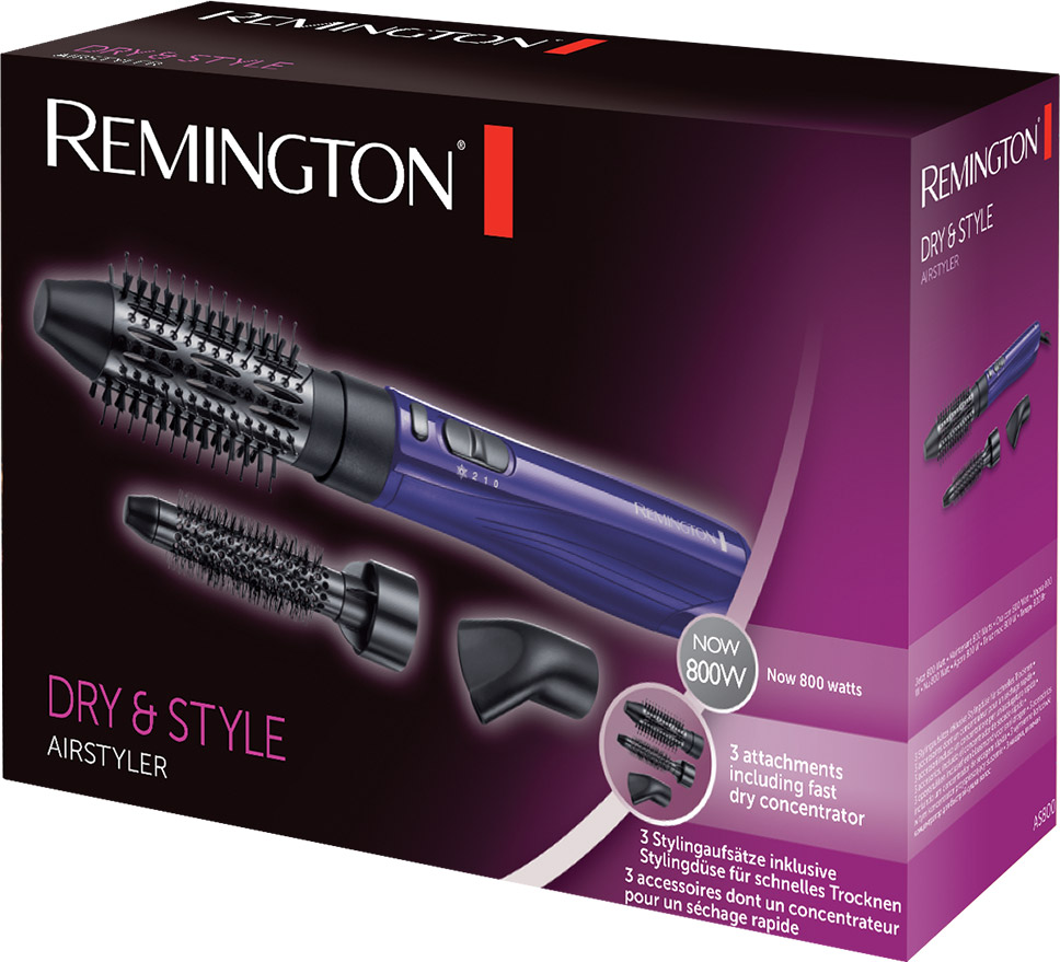 Фен-расческа мощностью 800 Вт, количество температурных режимов 2, количество скоростей 2, количество насадок 3, функции: ионизация, холодный обдув, дополнительно: вращающийся шнур, кнопка снятия насадок, петелька для подвешивания.