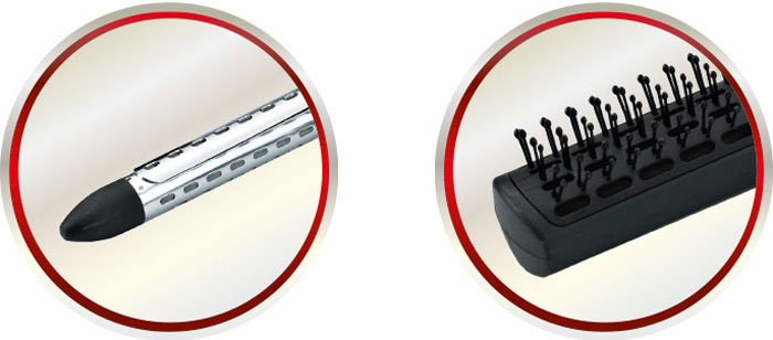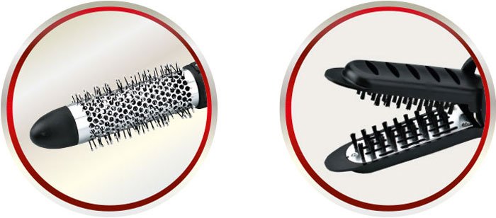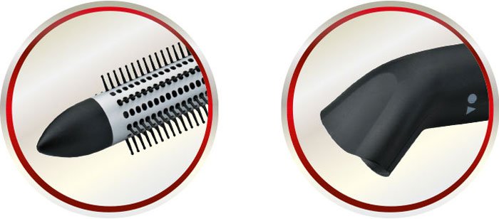 Фен-расческа мощностью 1200 Вт; количество температурных режимов 2; количество скоростей 2; количество насадок 6; функции: холодный обдув; дополнительно: вращающийся шнур, кнопка снятия насадок, петелька для подвешивания.