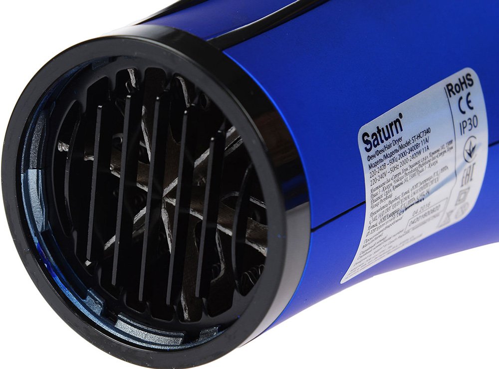 Бытовой, мощностью 2400 Вт, кол-во режимов интенсивности воздушного потока 2, кол-во режимов нагрева воздушного потока 3, независимая регулировка нагрева и воздушного потока, подача холодного воздуха, насадки в комплекте: диффузор, концентратор, дополнительно: петелька для подвешивания.