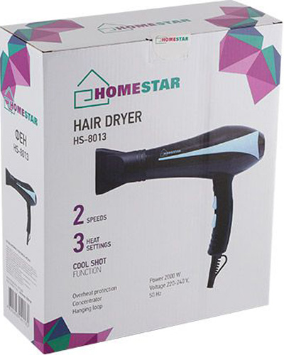 Бытовой фен, мощностью 2000 Вт, кол-во режимов интенсивности воздушного потока 2, кол-во режимов нагрева воздушного потока 3, независимая регулировка нагрева и воздушного потока, подача холодного воздуха, насадки в комплекте: концентратор, петля для подвешивания.