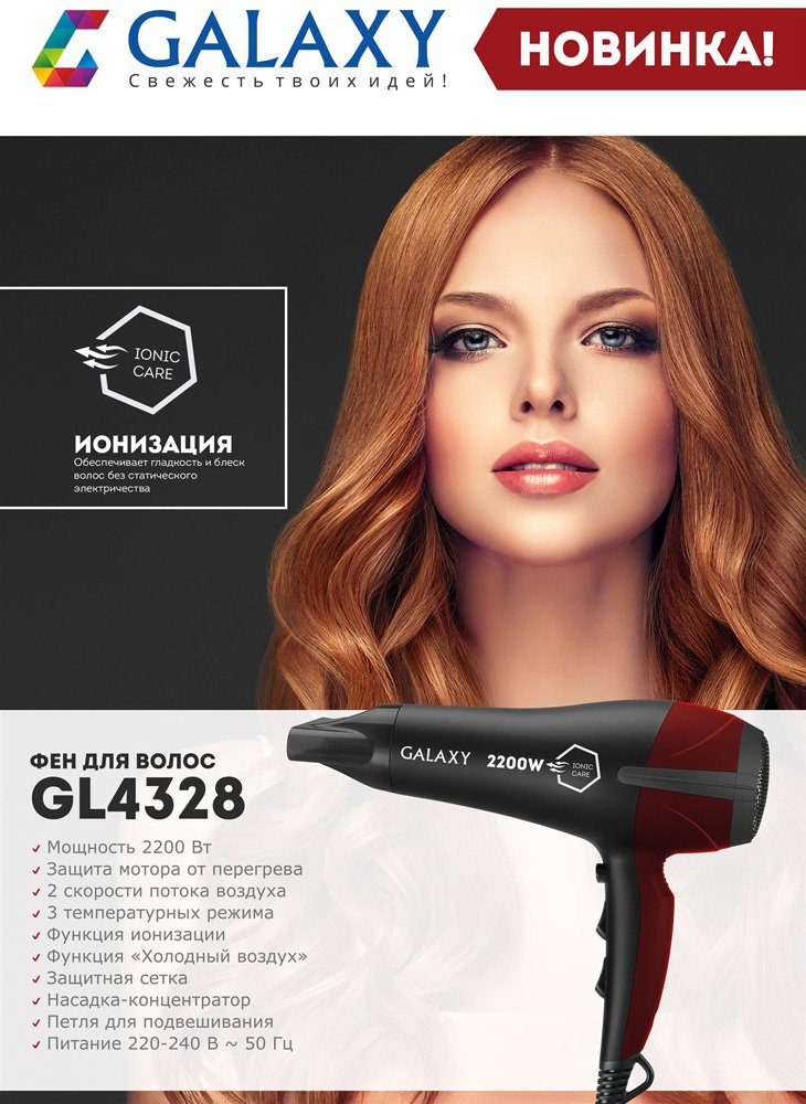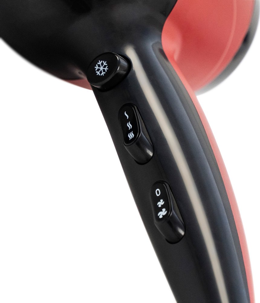 Бытовой фен; мощностью 2200 Вт; кол-во режимов интенсивности воздушного потока 2; кол-во режимов нагрева воздушного потока 3; независимая регулировка нагрева и воздушного потока; подача холодного воздуха; функция ионизации; насадки в комплекте: концентратор; петля для подвешивания.