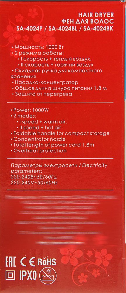 Дорожный фен; мощностью 1000 Вт; кол-во режимов интенсивности воздушного потока 2; кол-во режимов нагрева воздушного потока 2; насадки в комплекте: концентратор; петля для подвешивания.