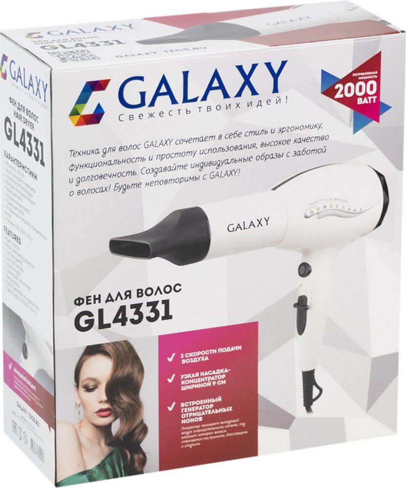 Бытовой фен; мощностью 2000 Вт; кол-во режимов интенсивности воздушного потока 3; кол-во режимов нагрева воздушного потока 3; подача холодного воздуха; функция ионизации; насадки в комплекте: концентратор; петля для подвешивания.
