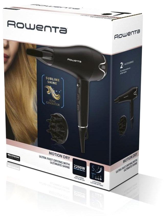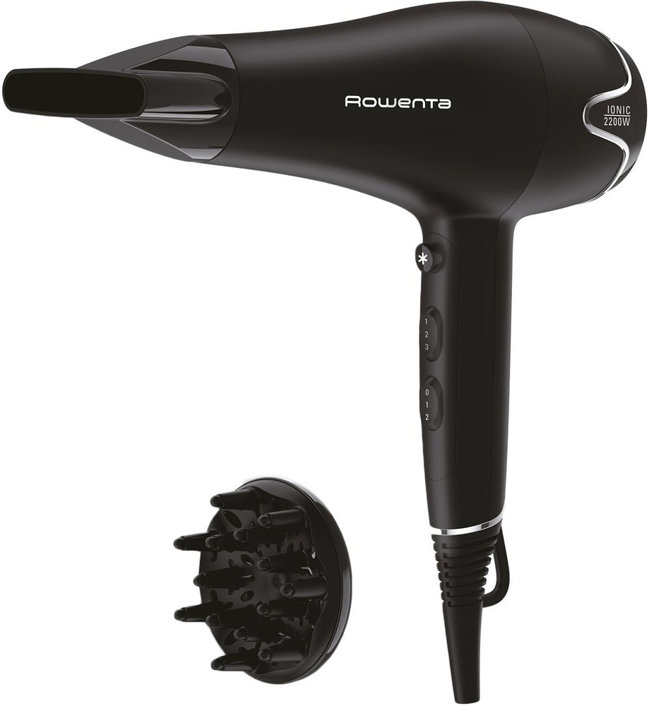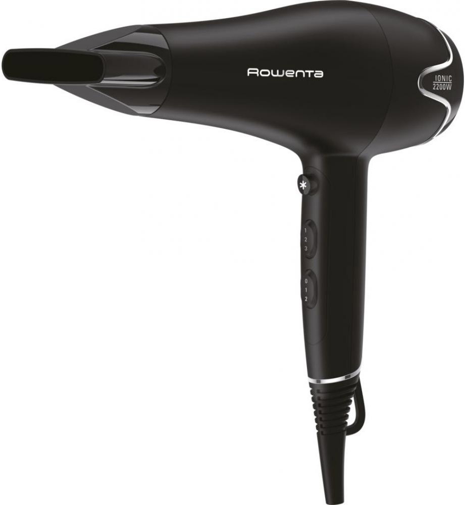 Бытовой фен, мощностью 2200 Вт, кол-во режимов интенсивности воздушного потока 2, кол-во режимов нагрева воздушного потока 3, независимая регулировка нагрева и воздушного потока, подача холодного воздуха, функция ионизации, насадки в комплекте: диффузор, концентратор, петля для подвешивания.