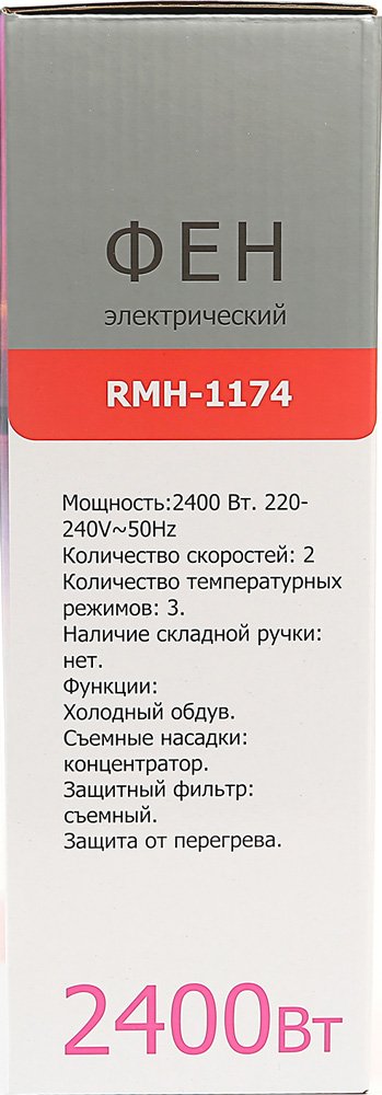 Бытовой фен; мощностью 2400 Вт; кол-во режимов интенсивности воздушного потока 2; кол-во режимов нагрева воздушного потока 3; независимая регулировка нагрева и воздушного потока; подача холодного воздуха; насадки в комплекте: концентратор; петля для подвешивания.