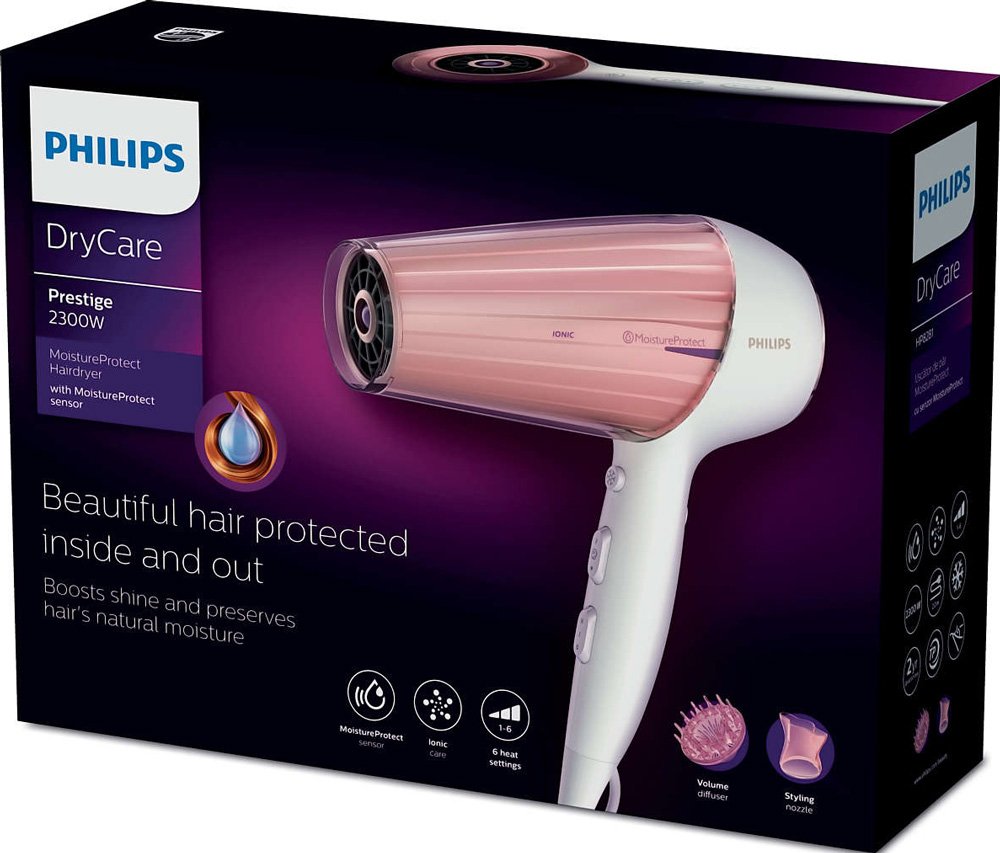 Бытовой фен; мощностью 2300 Вт; кол-во режимов интенсивности воздушного потока 2; кол-во режимов нагрева воздушного потока 3; независимая регулировка нагрева и воздушного потока; подача холодного воздуха; функция ионизации; насадки в комплекте: концентратор, диффузор; петля для подвешивания.