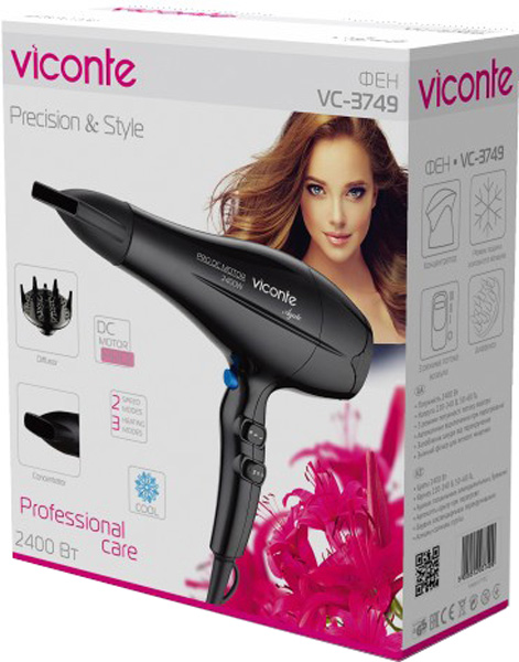 Бытовой, мощностью 2400 Вт, кол-во режимов интенсивности воздушного потока 2, кол-во режимов нагрева воздушного потока 3, независимая регулировка нагрева и воздушного потока, подача холодного воздуха, насадки в комплекте: диффузор, концентратор, дополнительно: петелька для подвешивания.