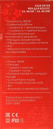 Дорожный фен; мощностью 800 Вт; кол-во режимов интенсивности воздушного потока 2; кол-во режимов нагрева воздушного потока 2; насадки в комплекте: концентратор; петля для подвешивания.