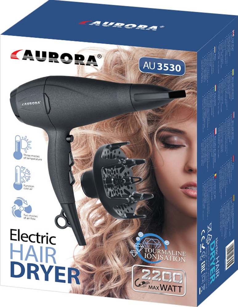 Бытовой фен; мощностью 2200 Вт; кол-во режимов интенсивности воздушного потока 2; кол-во режимов нагрева воздушного потока 3; независимая регулировка нагрева и воздушного потока; подача холодного воздуха; функция ионизации; насадки в комплекте: концентратор, диффузор; петля для подвешивания.