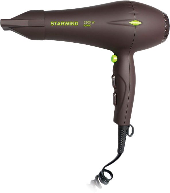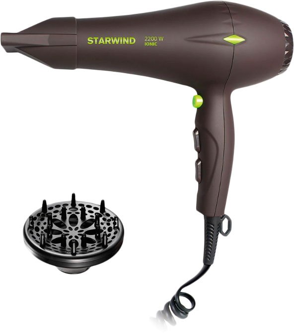 Бытовой фен; мощностью 2200 Вт; кол-во режимов интенсивности воздушного потока 2; кол-во режимов нагрева воздушного потока 3; независимая регулировка нагрева и воздушного потока; подача холодного воздуха; функция ионизации; насадки в комплекте: концентратор, диффузор; петля для подвешивания.