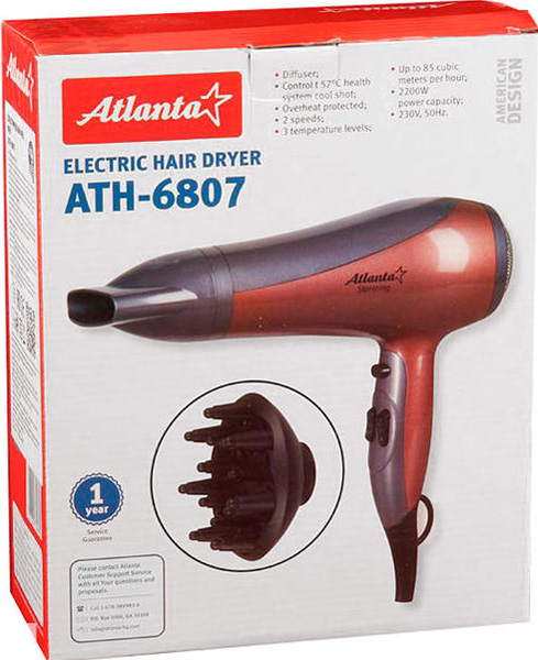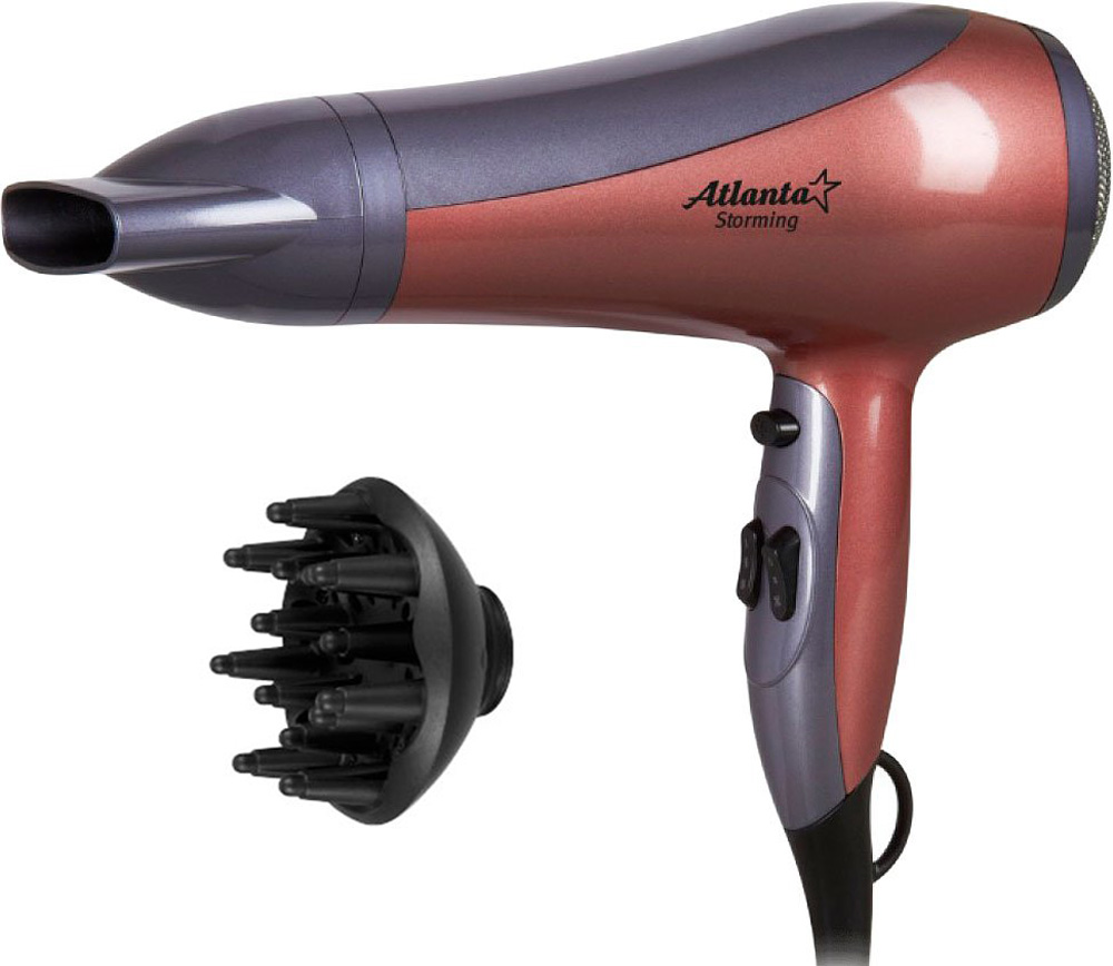 Бытовой фен, мощностью 2200 Вт, кол-во режимов интенсивности воздушного потока 2, кол-во режимов нагрева воздушного потока 3, независимая регулировка нагрева и воздушного потока, подача холодного воздуха, насадки в комплекте: диффузор, концентратор, петля для подвешивания.