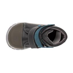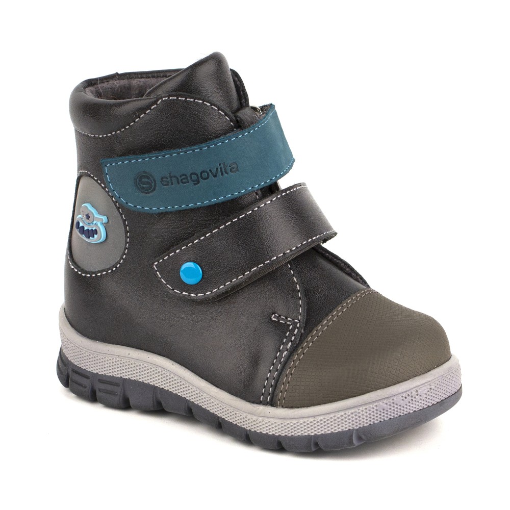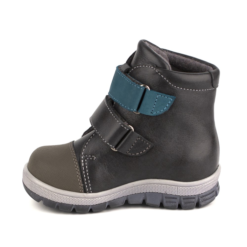 Удобные повседеныные ботиночки для мальчика. Натуральная кожа серого цвета, носок укреплен дополнительной кожаной нашивкой. Ботинки украшены нашивкой-виньеткой. Ботинки регулируются по полноте ножки, застегиваются на удобные липучки. Двойная подошва из современного материала термоэластопласт (ТЭП) гибкая и прочная. Высокий жёсткий задник способствует правильному формированию стопы. Изнутри ботинки утеплены байкой.