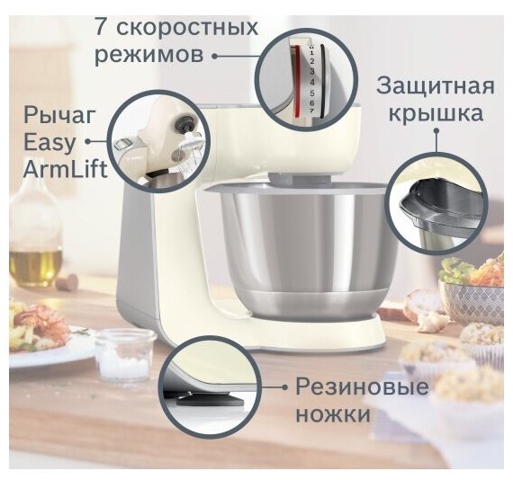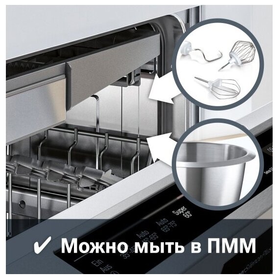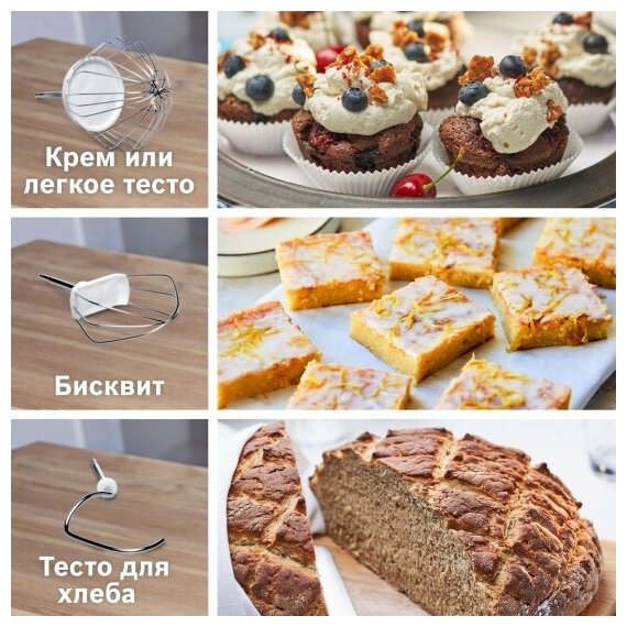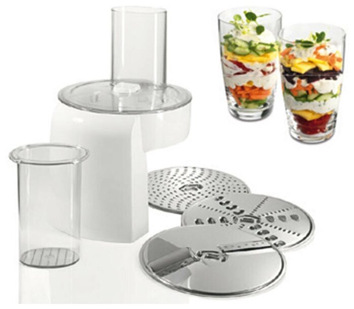 • Насадки насадка для теста, насадка для взбивания, терка, насадка для нарезки ломтиками, диск для нарезки соломкой, общее число насадок: 7