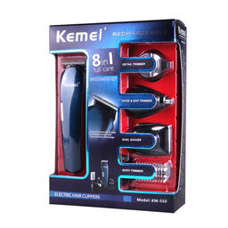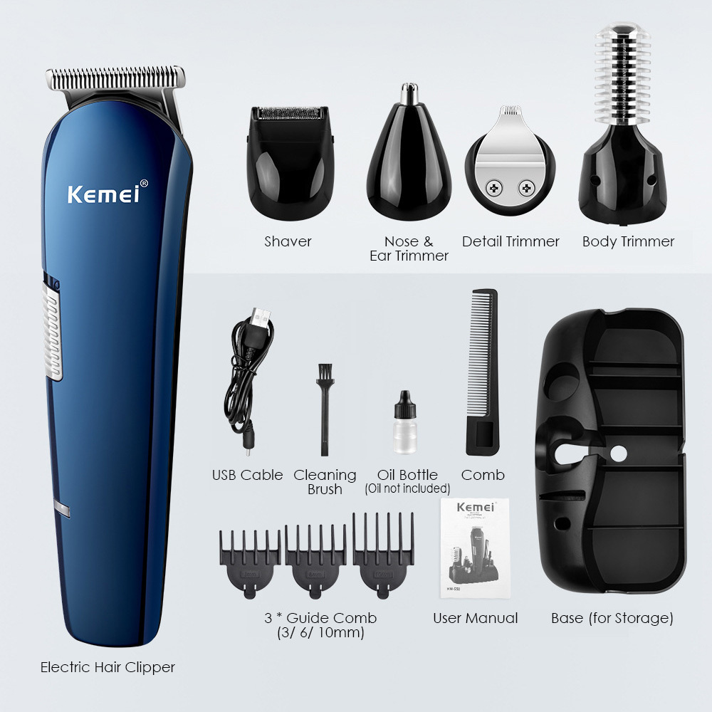 • Комплектация 1 * Машинка для стрижки волос 3 * Направляющая Расческа (3мм, 6мм, 10мм) 1 * Щетка для очистки 1 * Бутылка масла (масло не входит) 1 * Деталь Триммер 1 * Триммер для носа и ушей 1 * Бритва 1 * Триммер для тела 1 * Расческа 1 * База 1 * USB-кабель (без штекера) 1 * Руководство пользователя (английский, арабский)