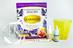- Комплектация Прозрачная мыльная основа, парфюмерное масло "Лаванда", красители, формочки, стакан, 2 палочки для размешивания, перчатки