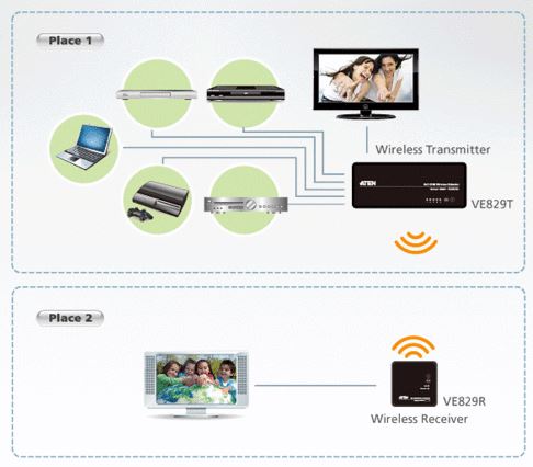 - Комплектация 1x VE829T 5x2 HDMI беспроводной передатчик, 1x VE829R 5x2 HDMI беспроводной приёмник, 2x Пульты дистанционного управления с батарейками, 1x Компонентный кабель адаптера, 1x ИК-кабель (передатчик), 1x ИК-датчик кабеля (приемник), 2x Блока питания, 1x HDMI кабель, 1x Руководство пользователя