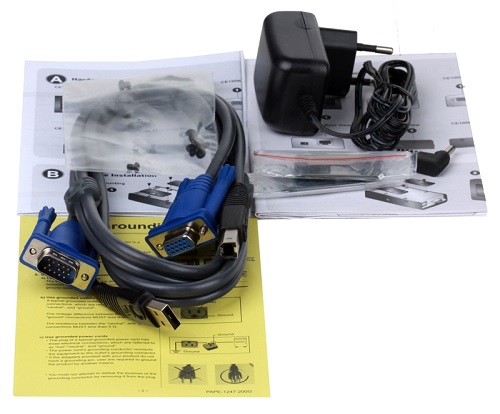 - Комплект поставки KVM-удлинитель Mini USB CE100L (локальный модуль), KVM-удлинитель Mini USB CE100R (удаленный модуль), шнур USB/VGA, заземляющих провода, адаптер питания (для удаленного устройства), комплект для монтажа, руководство пользователя