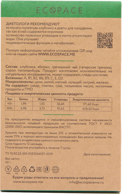 - Состав клубника, яблоко, гречишный чай (татарская гречиха), сироп топинамбура