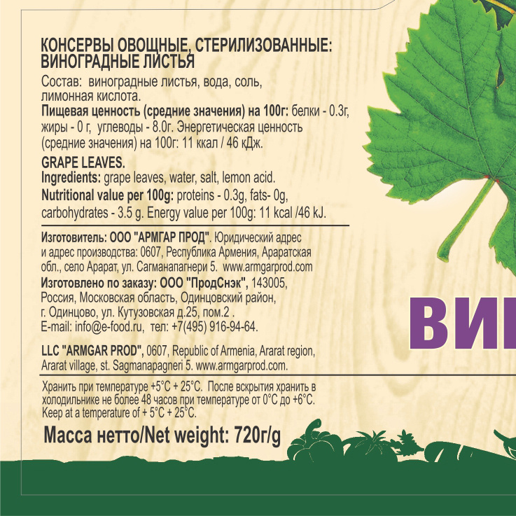 - Состав Виноградные листья, вода, соль, лимонная кислота
