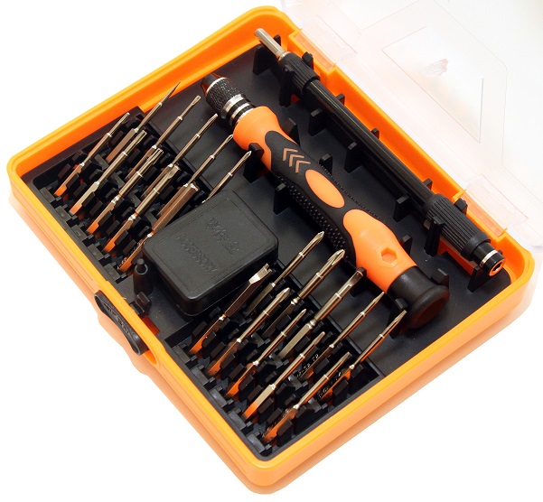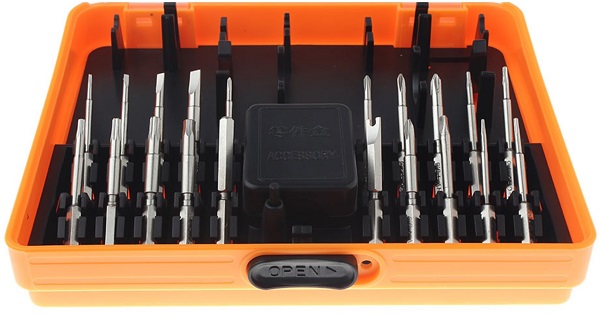- Комплектация Отвертка-держатель с антискольжением, гибкий удлинитель отвертки, пинцет для точных работ, насадки плоские SL1.0, SL1.5, SL2.0, насадки крестовые PH1.0, PH1.5, PH2.5, PH3.5, насадки звезда (torx) T2, T4, T5, T8, T10, насадки шестигранные (hex) H3.0, H4.0, насадки звезда (pentalobe) 0.8, 1.2, насадка трехгранная (triangle) 2.3, насадки трехлопастные (tri-wing) 0.8, 2.5, насадка вилка (spanner) 2.6, пластиковый пенал-органайзер