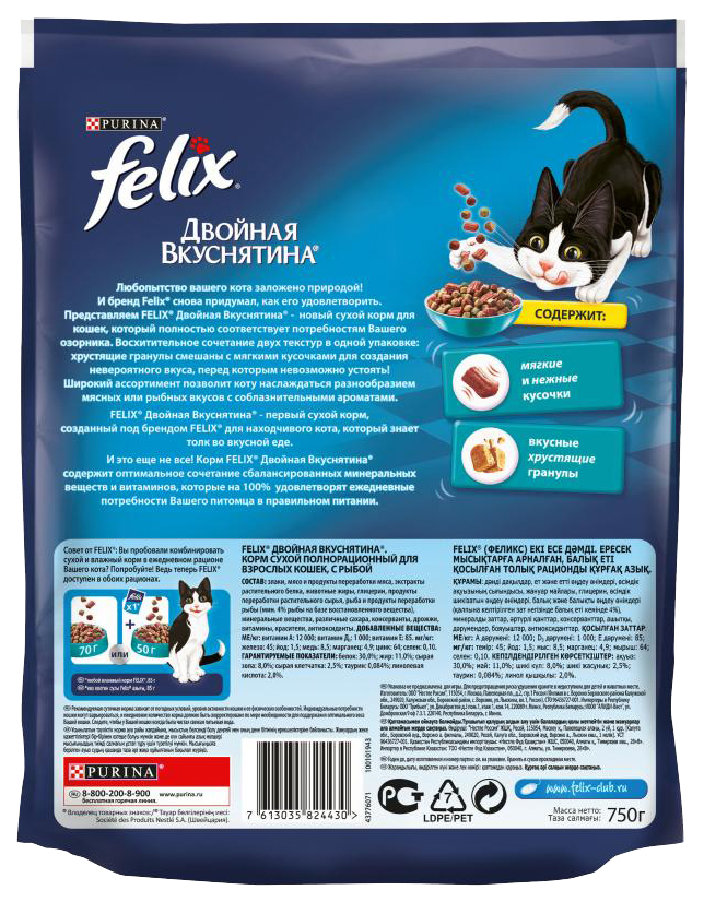 - Ингредиенты злаки, мясо и продукты переработки мяса, экстракты растительного белка, животные жиры, глицерин, продукты переработки растительного сырья, рыба и продукты переработки рыбы (минимум 4% рыбы на базе восстановленного вещества), минеральные вещества, различные сахара, консерванты, дрожжи, витамины, красители, антиоксиданты