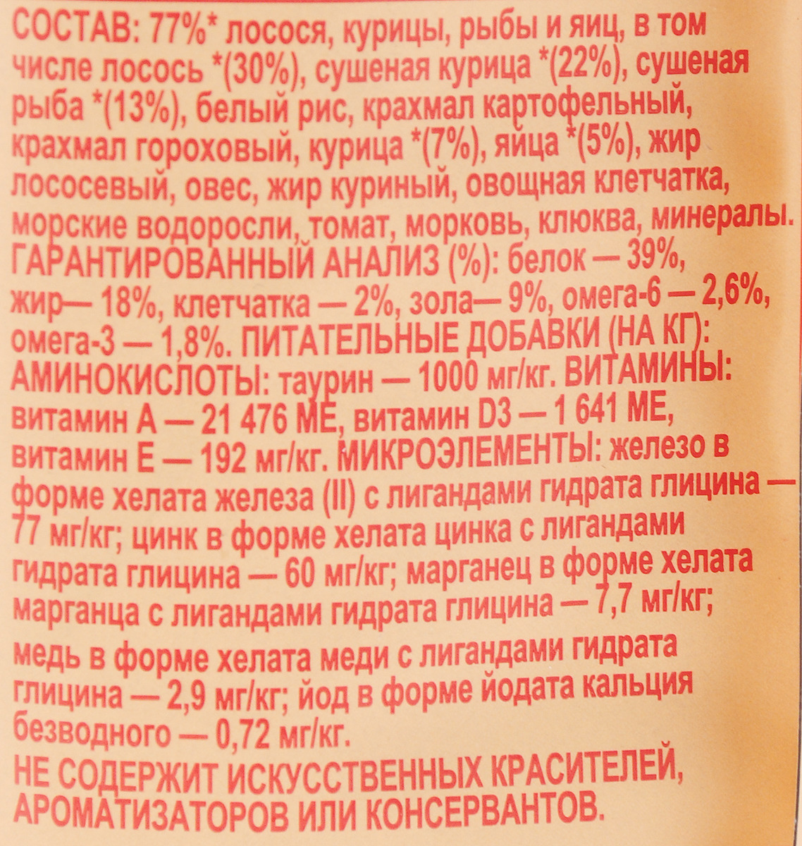 - Ингредиенты 75% лосося, курицы и яйца (27% свежего мяса лосося, 18% дегидрированной рыбы, 17,5% дегидрированного мяса курицы, 5% сухого яичного продукта, 4% куриного жира, 2% куриного бульона, 2% лососевого жира), рис, картофельный крахмал, гороховый крахмал, овес, сушеный томат, морские водоросли, овощная клетчатка, сушеная морковь, сушеная клюква