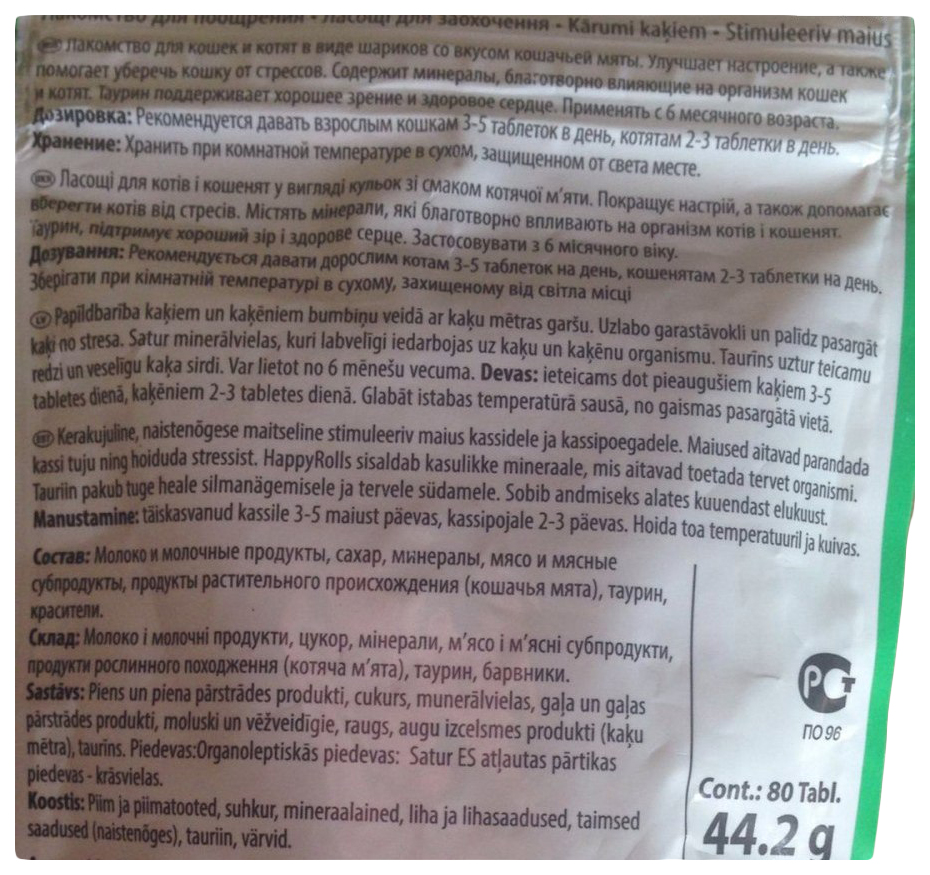 - Ингредиенты минеральные вещества; молоко и молочные продукты; мясо и мясные субпродукты; продукты растительного происхождения (кошачья мята); сахар