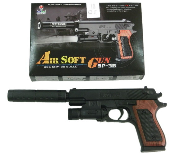 - Комплектация пистолет, фонарик, глушитель, пульки.