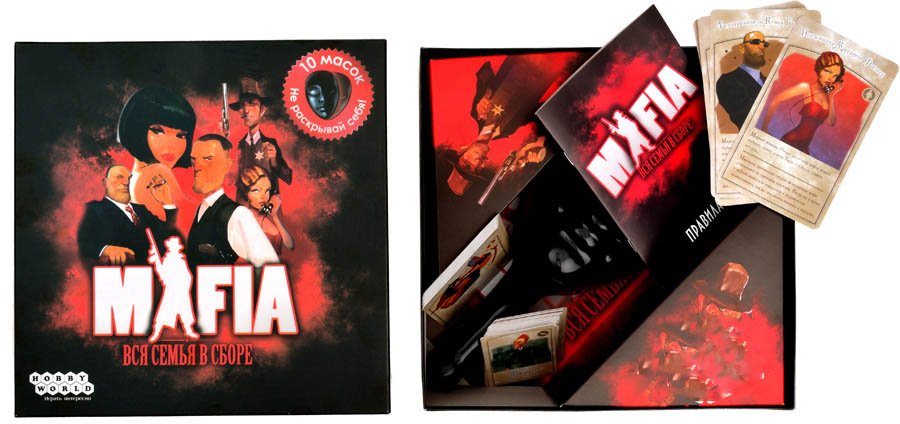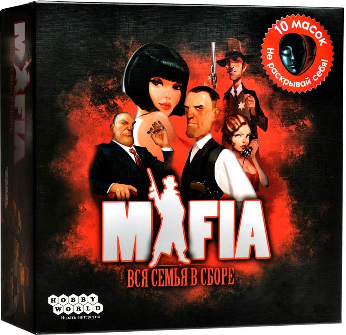 Командная ролевая игра, повествующая о непримиримом противостоянии Мафии и Мирных жителей. Задача Мафии - под покровом ночи устранить всех Мирных жителей, которые, в свою очередь, днем пытаются найти и обезвредить Мафию. Состав игры: 10 пластиковых масок, 30 карт ролей, 21 карточка для ведущего, правила игры.